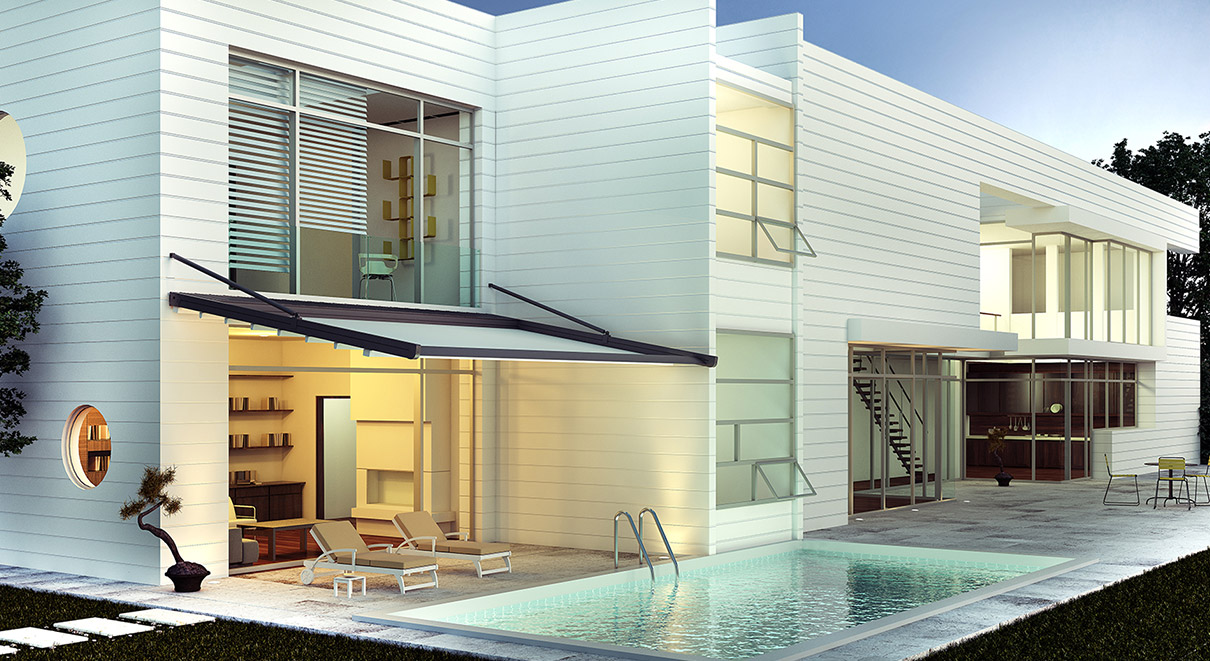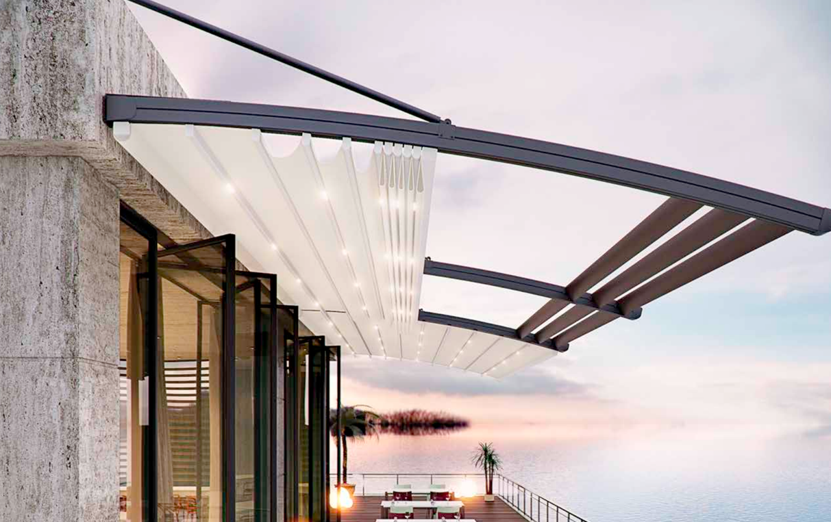 挑檐式電動遮篷 寬度: 1000~4500mm 伸縮長度: 1000~4500mm 下部弧形支撐 上部水平天幕簾